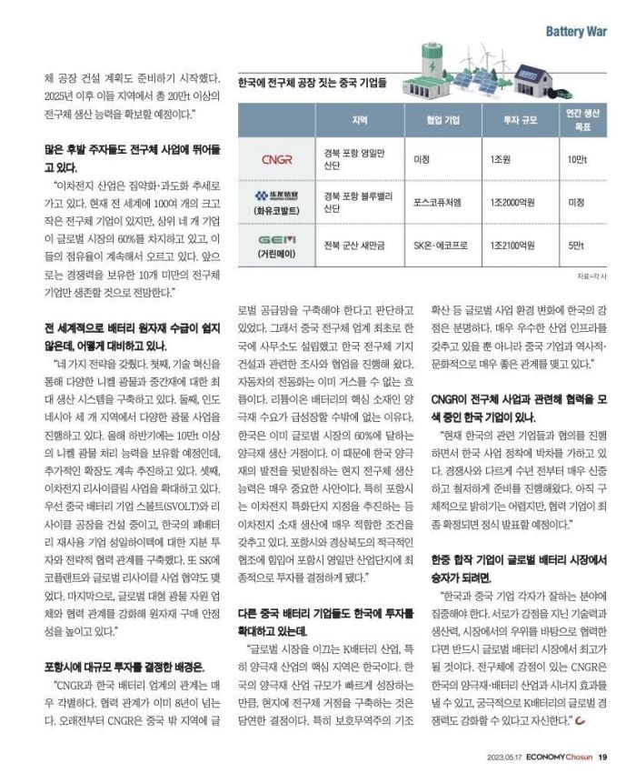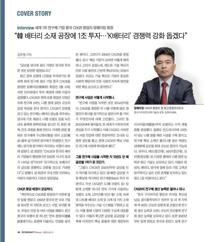 近日,韓國(guó)權(quán)威經(jīng)濟(jì)周刊《Economy Chosun(經(jīng)濟(jì)朝鮮)》專訪中偉股份董事長(zhǎng)鄧偉明,并以“封面故事”刊發(fā)在第492期以“電池之戰(zhàn)”為主題的周刊中。