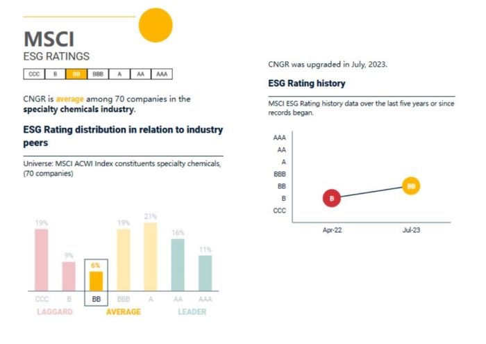 在2023年的標普CSA評分中,中偉股份得分38分,與去年相比提升了10分。值得一提的是,這一分數(shù)已達到入選“標普中國可持續(xù)發(fā)展年鑒”門檻,代表中國可持續(xù)發(fā)展標桿示范企業(yè)水平。與此同時,中偉股份在明晟的ESG評級也由2022年的B等級提升到了2023年的BB等級,這一評級結(jié)果與相關上下游企業(yè)相比,已處于中間水平。在富時羅素的ESG評分中,中偉股份也取得了2.6分的好成績,這一分數(shù)已顯著高于行業(yè)平均水平。