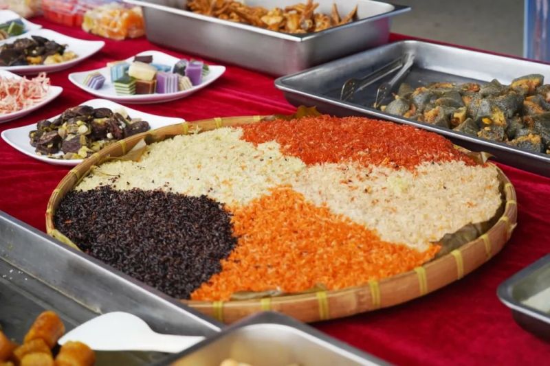 伴隨著此起彼伏、高遏行云的歌聲,另一邊的長桌美食盛宴也拉開帷幕,有象征吉祥如意、五谷豐登的五色糯米飯;有清香四溢、滿口香甜的各色水果;有清甜軟糯、蘊含著壯族人民對美好生活向往的粽子;還有各式各樣、滿口留香的面點......食材豐富,色香味俱佳,把壯鄉(xiāng)民俗特色展現(xiàn)得淋漓盡致。