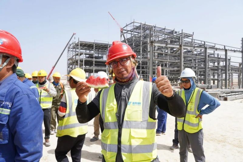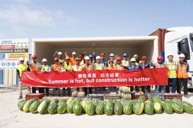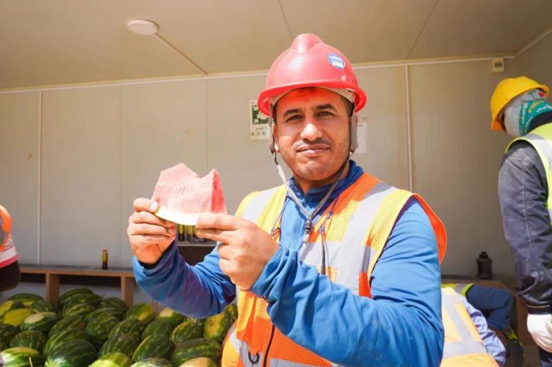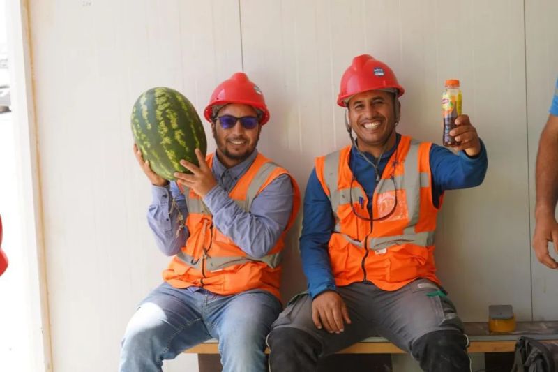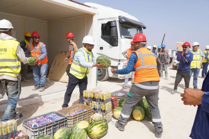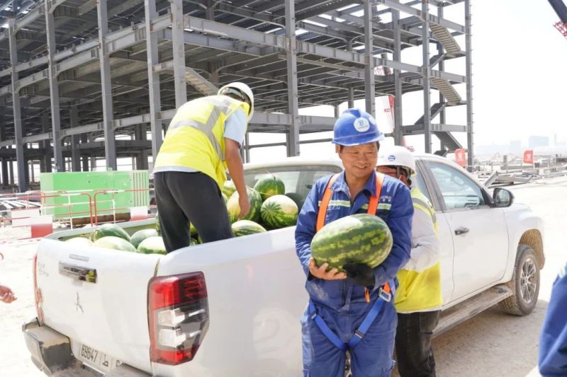 盡管高溫炙烤,項目現場的工人們仍堅守一線、不畏酷暑、辛勤工作,確保工程建設的順利進行。此次,摩洛哥項目組為施工人員準備了500瓶酸奶、500瓶涼茶、2000斤西瓜等防暑降溫物品,按各單位人數送至施工現場分配發放。