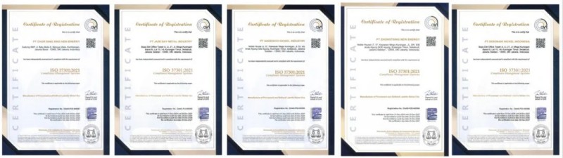 2024年10月,中偉印尼大區與國際專業評級機構DAAS展開評審工作,針對中偉股份印尼大區中青新能源有限公司、印尼中偉鼎興新能源有限公司、印尼德邦鎳業有限公司、翡翠灣金屬工業有限公司、納德思科里克工業有限公司五個主要生產主體同步開啟認證工作,并于近日完成全部認證。