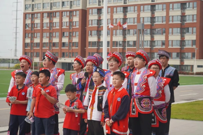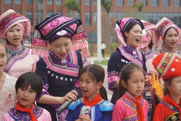隨著一陣清脆的竹笛聲響起,基地員工、社區居民和學校師生們身著靚麗民族服飾隆重登場,化身“劉三姐”和“阿牛哥”進行山歌對唱。大家以歌言志、以歌會友、以歌傳情,唱響社企共建的優美旋律,讓動聽山歌在新時代的舞臺上煥發出全新光彩。