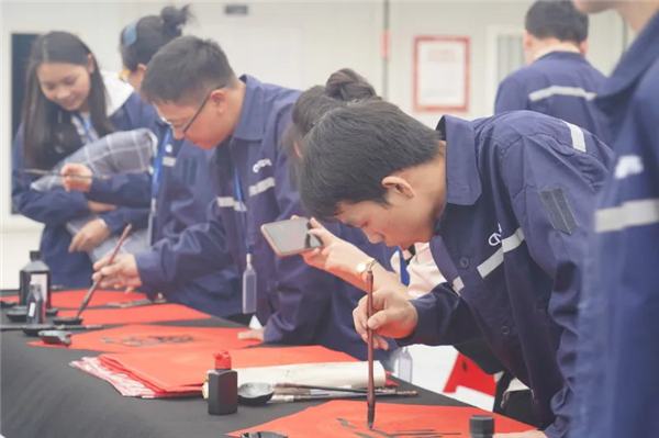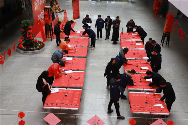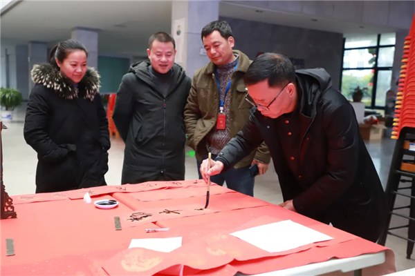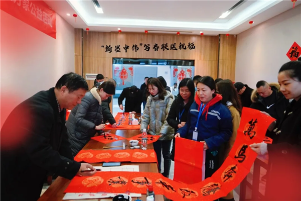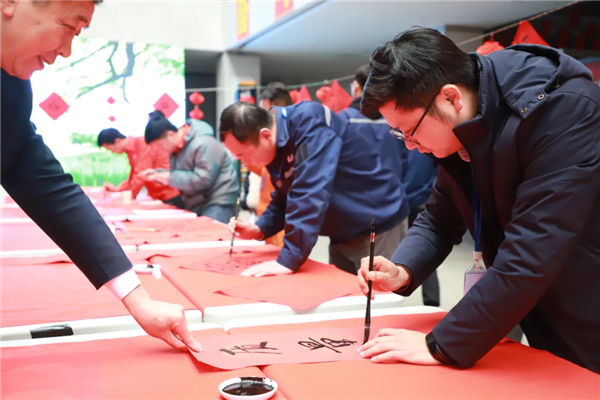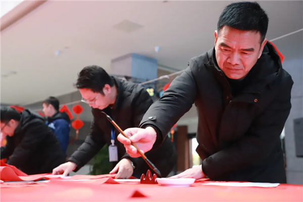 書法愛好者揮毫弄墨,筆尖如行云流水,將美好祝福揮灑,字里行間飽含對公司和同事的祝愿。一旁的看客或幫忙固定紙張,或仔細端詳一幅幅紅火的春聯,為書法大師點贊,在緊張忙碌的工作之余,體驗到了不一樣的歡樂。